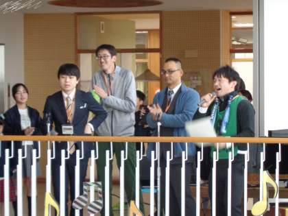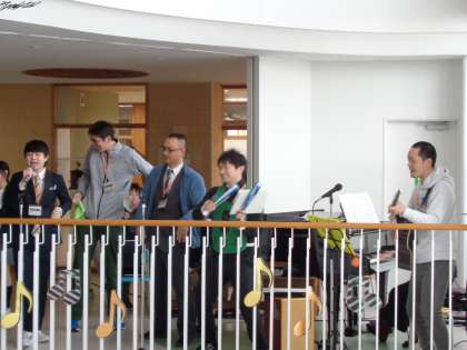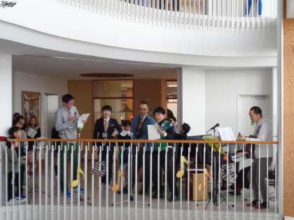 ふきぬけコンサートには、先生方の演奏もありました!まずは、男性4人組で「キセキ」を歌いました。そして、教頭先生からのサプライズプレゼントがありました。それは「ネームソング」というオリジナル曲です。6年生20人の名前と、担任の先生の名前+令和5年度卒業生の文字すべてを使って教頭先生が作られた詩に、ギターが得意な保護者の方に、曲をつけてもらいました。6年生からは、「サイコー!」「すごい!」などの声が聞こえてきました。