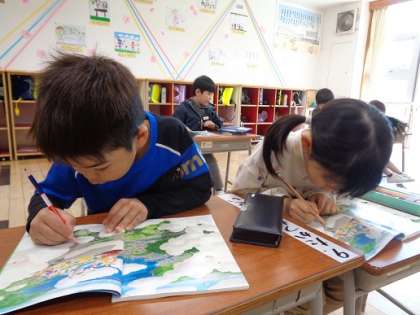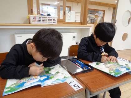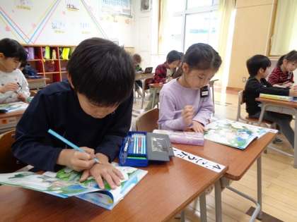 今日は初めて国語の教科書を使って学習しました。教科書の挿絵を見ながら、どんなことをしているか、何と言っているか、みんなで予想して楽しみました。写真は、紙飛行機に乗って空を飛んでいる子供たちの挿絵を見て、「景色を見ているんだよ」といった子供の発言から、みんなも見てみようと、何が見えるか見つけている様子です。見つけたものを一人一つ発表しました。