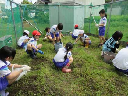 今日の生活科の時間は、これから育てる野菜の畑づくりをしました。畝は、野菜作り名人さんが作ってくださる予定です。その準備として、2年生全員で草むしりをしました。子供たちは、自分の畑の場所を中心に一生懸命に草を取り、途中にミミズが出てきたら大騒ぎするなど、楽しみながら活動していました。