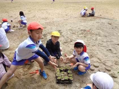 今日の3時間目は図工の「すなやつちとなかよし」でした。掘り進めて池をつくったり、川や山をつくったり、型を使ってケーキをつくったりするなど、思い付いたことをどんどん試していました。