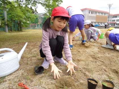 今日の3時間目は図工の「すなやつちとなかよし」でした。掘り進めて池をつくったり、川や山をつくったり、型を使ってケーキをつくったりするなど、思い付いたことをどんどん試していました。