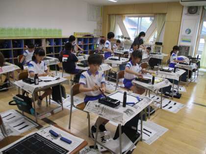 3年生は今日の2時間目に書写をしました。毛筆が始まって2回目でしたが、どの子供も落ち着いて準備をすることができました。