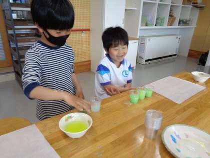 今日の1年生の図工では「からふるいろみず」を行いました。1時間目では、絵の具を水に混ぜて、たくさんの色水を作り楽しみました。「こんな色になった!」「ジュース屋さんだよ!」と、作った色水を見せてくれました。