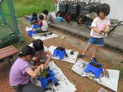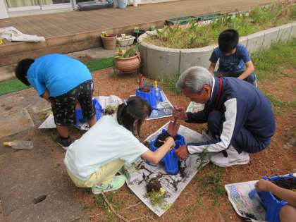 春に咲いていたチューリップとパンジーの鉢に枝豆を植えました。今まで育てていたパンジーは抜きたくないと、家にパンジーを持ち帰る子供もいました。愛着が沸いてきたのですね。