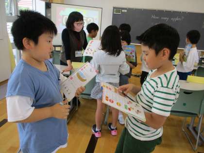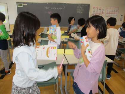 3年生の5時間目は外国語活動でした。色を塗ったりんごの数を尋ねる活動では、明るく笑顔で「Hallo〜!」と言って友達に話しかける姿や、英語で元気にじゃんけんする姿など楽しみながら外国語活動に取り組んでいました。
