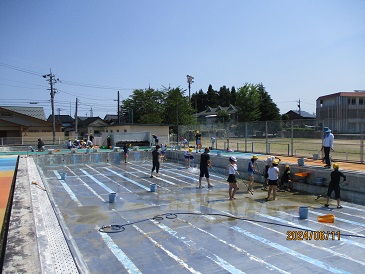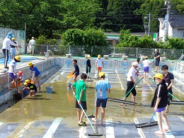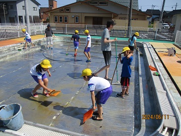 今日は、大プールと小プールの掃除をしました。5年生も6年生も、真剣にプールをきれいにしていました。子供たちは、きれいになったプールを見て、「早く水泳学習をしたい」と意欲を高めていました。今月のプール開きが楽しみです。
