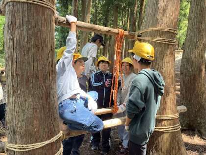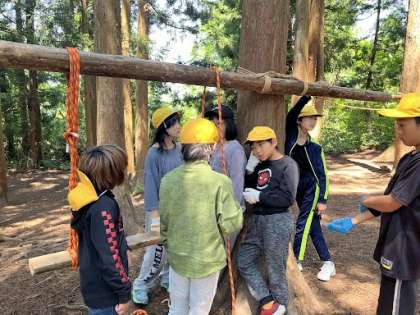 午前中は、森の遊び場づくりをしています。丸太を運び支えああいながらロープをしばり、シーソーやブランコを作りました。