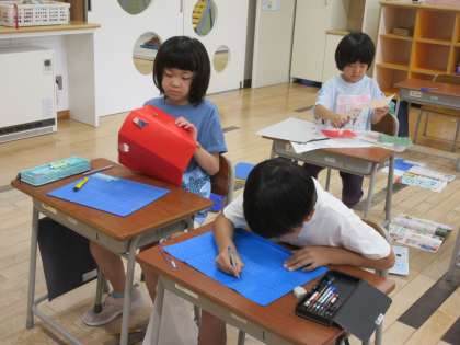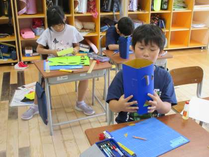 2年生は、図工の時間にカッターを使い始めました。先週は、カッターの使い方を練習しました。今週からは、作品を作り始めました。塔型か屏風型を選び、カッターを使って、窓を作っていきます。来週は、窓の中に見える物や全体の飾りを作っていきます。