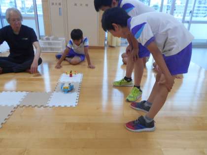 講師の方をお招きし、プログラミング学習を行いました。ロボットの車にプログラミングをして、荷物を指定された場所に届けるミッションに挑戦しました。「〇cm進む」「90度右に回る」等、プログラムの順番を相談しながら考えていました。