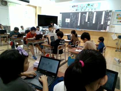 写真は、ちいちゃんの気持ちについて学級全体で聴き合い、学習の終わりに自分の考えをクロムブックで入力しているところです。