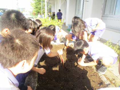 朝から、花壇の手入れをしている学年がありました。花壇は、来年の春に咲くチューリップの球根に植え替えます。