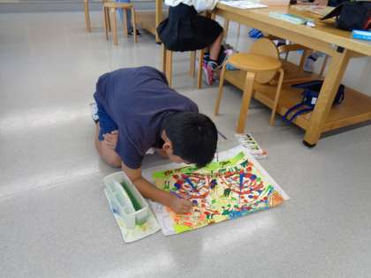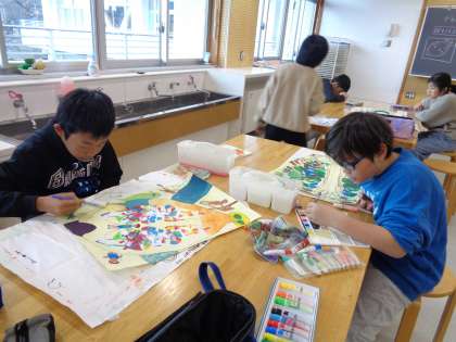 図画工作科「デカルコマニーから見える世界」の作品がまもなく完成します。想像を膨らませながら、伸び伸びと描く4年生。色彩豊かで、ダイナミックな作品は、見ているだけで元気がもらえます。