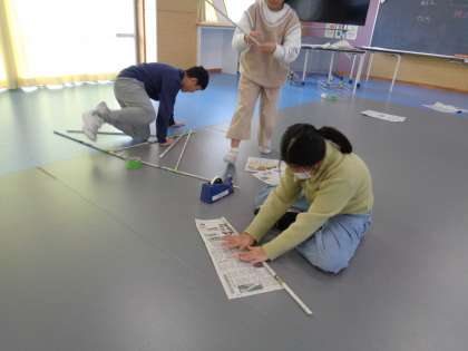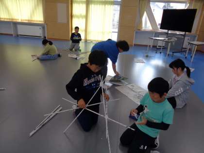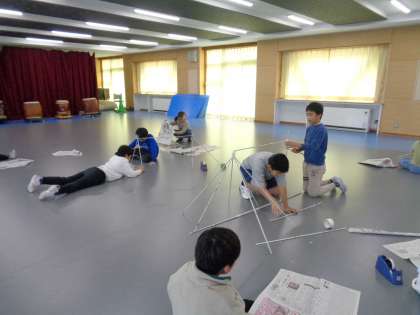 図画工作科の学習は「つなぐんぐん」です。棒状に丸めた新聞紙をどんどんつないでいきます。あまり考えずにつないでいくと、立体的になり、そのうち重ねたり、折り曲げたりするなど、自然に工夫が生まれ、制作することそのものを楽しんでいる子どもたちです。