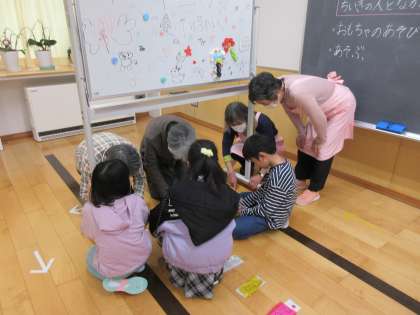 今日は、「おもちゃの森」に地域の方が参加してくださいました。子供たちが作ったおもちゃで、一緒に遊びました。地域の方が、とてもやさしくて、「楽しいね」「おもしろいね」と言ってくださり、子供たちは、とても喜んでいました。