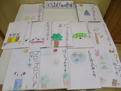 これは、子供たちが書いた「うごくおもちゃの作り方」の本です。昨日、カフェ和いわいのみなさんにも読んでいただきました。分かりやすいように文を考え、文字も絵もていねいに書きました。