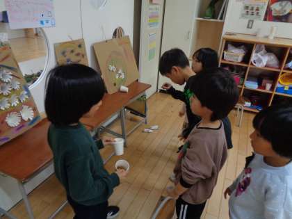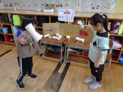 1時間目「あきのおもちゃやさん」に2年生を招待して遊んでもらったあと、1年生でも遊び合いをしました。今まで、自分たちのおもちゃづくりに集中して頑張ってきた子供たちは、「これしたかったんだよね!」「楽しい!」と、自分のおもちゃやさんを離れて友達がつくったおもちゃで遊びました。