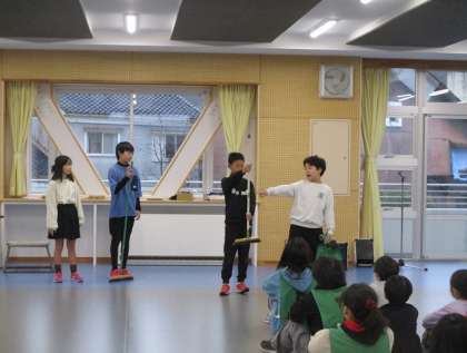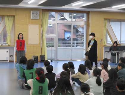 今日のなかよしハッピータイムでは、環境・美化委員会の発表がありました。「そうじ伯爵 クリーン三世」が、クイズ形式で掃除の仕方を教えてくれました。選択問題では、全身で答えを表現していました。写真は「C」を選択している場面です。