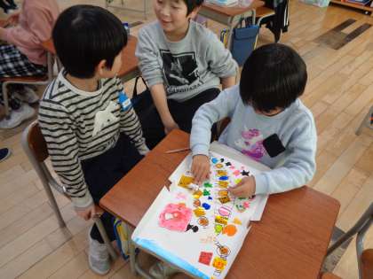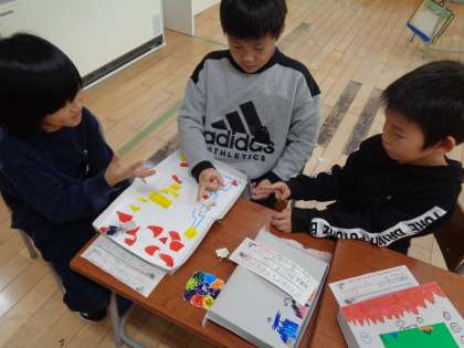 図画工作科でつくった「わくわくすごろく」で遊びました。自分や友達のすごろくで遊び合い、とても楽しそうな子供たちでした。子供たちがつくったマスには、様々な仕掛けがあるため、ゴールまでの道のりが簡単なものではなく、みんな盛り上がっていました。