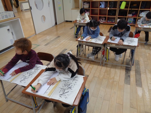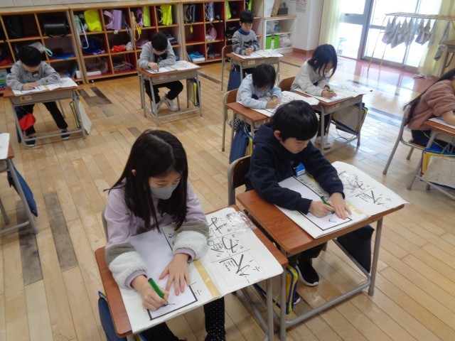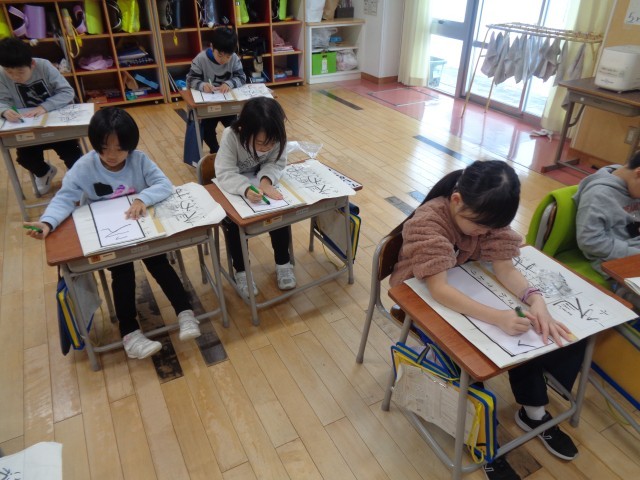 1年生にとっては、小学校初めての書初大会。「冬休み練習してきたよ!」と冬休みの練習の成果を見せてくれました。本番では、静かに集中して取り組んでいた子供たち。素敵な作品に仕上がりました。