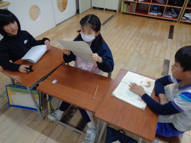 国語科「くわしくきこう」の学習で、グループになって冬休みの思い出を発表し、友達の話を聞いて、もっと知りたいことを質問しました。話している子供も、聞いている子供も楽しそうでした。楽しい素敵な冬休みを過ごしたことが伝わってきました。