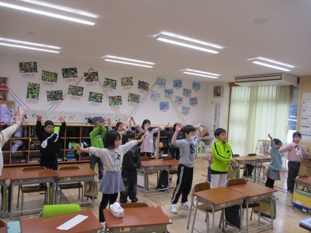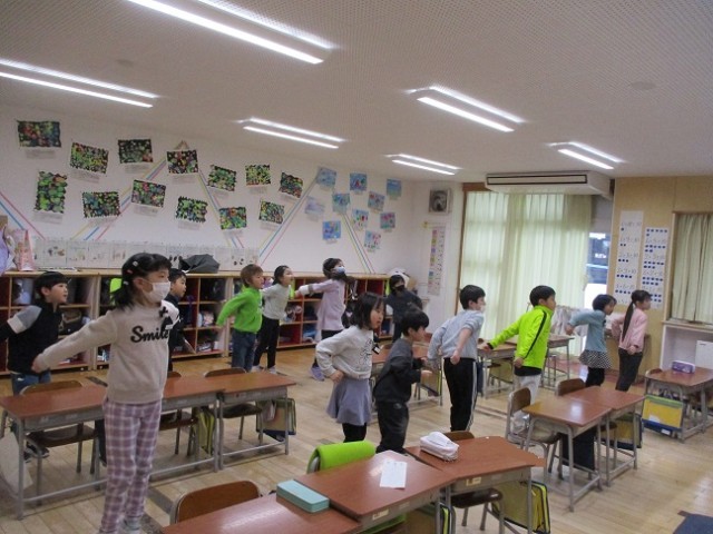 朝の会の時間、1年生はダンスをしています。みんな笑顔で元気いっぱいです。