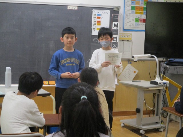 水曜日から、給食係さんがみんなのために素敵な取り組みを行っています。「みんなにおいしく給食を食べてもらいたい」という思いから、「よい姿勢で食べましたか」「残さず食べましたか」等の振り返りカードを自分たちで作り、みんなに配付しました。給食の時間には「良い姿勢で食べようね。」「今日も食べきるぞ!」と声をかけていました。そのおかげで、2日連続で全員完食(食べキリン)をすることができました。