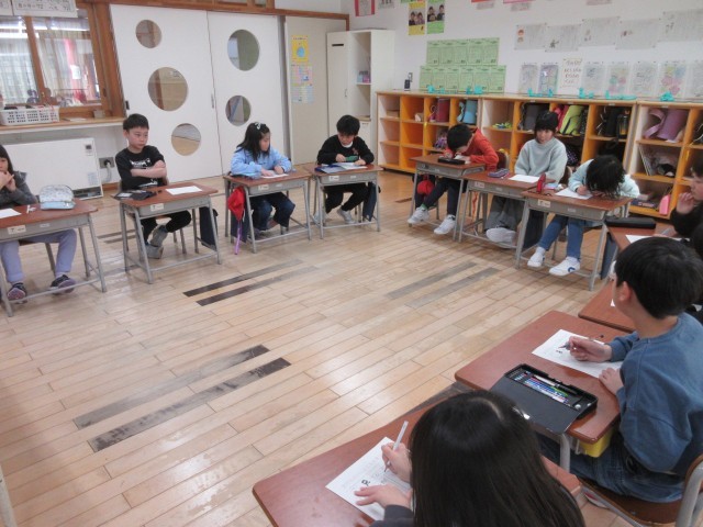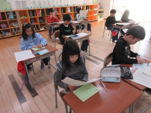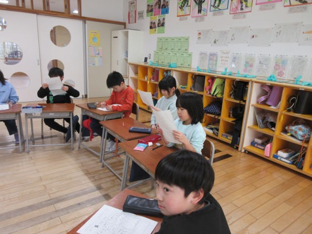 国語「すてきなところをつたえよう」の学習で、友達に手紙を書いていました。今日は、友達に書いた手紙を渡し、その返事を書きました。また、生活科の時間には、その他の友達のいいところをカードに書いて伝え合いました。机をコの字型にして、互いの顔を見合いながら、書きました。子供たちは、「会議みたい」と話し、友達からのたくさんの素敵を読んで、とってもうれしそうでした。
