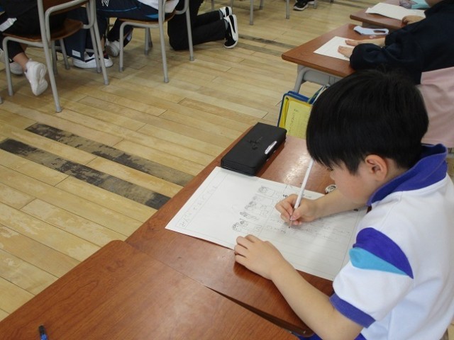 「緊張したけど笑顔でお出迎えができたよ」「学校探検で、年長児さんが喜んでくれて、うれしかったよ」「年長児さんや保育所の先生が笑顔だったので、うれしかった」等、うれしかったことやがんばったことをたくさん発表し、自分たちのがんばりや成長を喜び合うことができました。その後、昨日の様子を絵日記に書きました。1年生の満足そうな表情が、印象的でした。