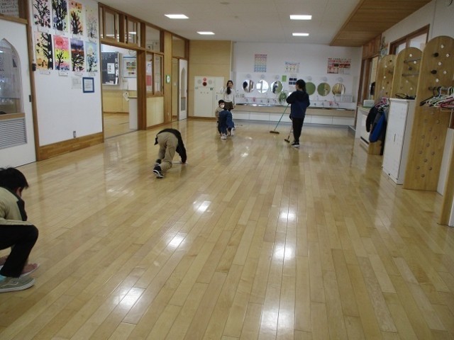 今日は、教室とワークスペースのワックスがけ。まずは、子供たちがほうきできれいにはき、雑巾で水拭きしました。次に、教職員でワックスをかけました。