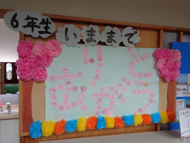 今日は、玄関前の掲示と卒業おめでとう集会の準備をしました。写真にあるありがとうの文字は、全校児童や教職員に書いてもらった桜のメッセージカードで作られています。