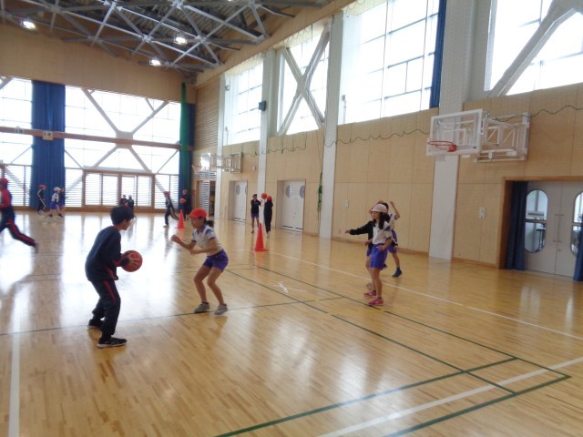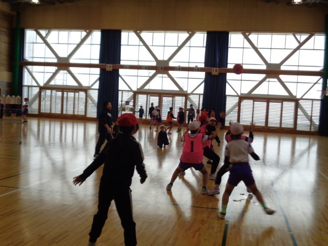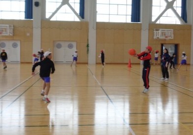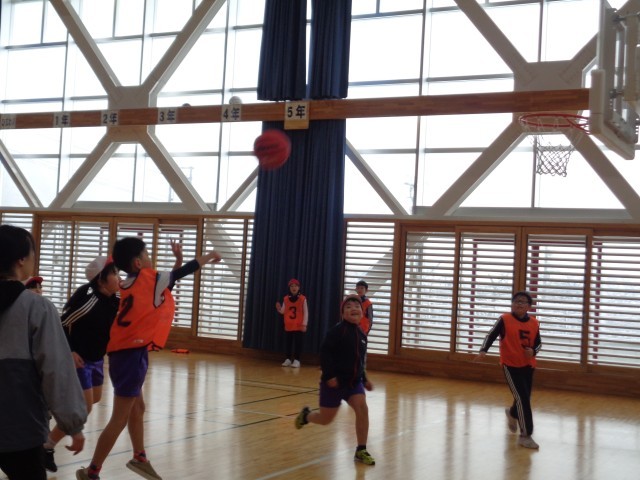 授業の前半は、チームごとに、パス練習やディフェンスを避けてシュートをする練習をしました。後半は、チームで今日の目標を決め、ハーフコートでの試合を行いました。本格的な試合は初めてでしたが、みんなで声をかけ合ってパスをつなげたり、試合に出ていない人も「がんばれ」と大声で応援したりと、とても盛り上がる試合となりました。