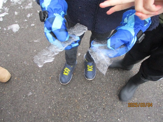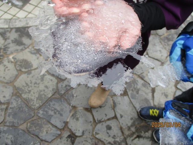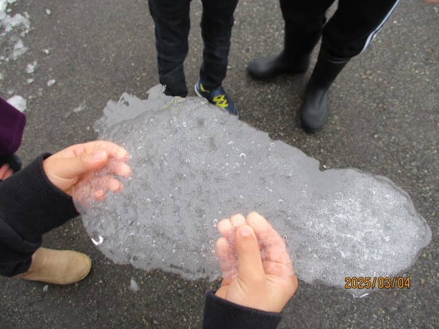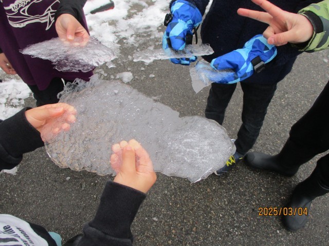 3月4日の朝は、大変冷え込んでいて、学校の玄関前の至る所に、氷が張っていました。「こんなに大きな氷がある」「すごい透き通っていてきれい。端の方は、結晶みたい」「長い剣みたいな氷もあるよ」と、氷を見せ合う子供たち。「こんなにきれいで、氷の芸術みたいだね」と、一人の子供が言うと、「本当にきれい!先生、写真に撮って、ホームページで紹介したらいいんじゃない?」と、一緒に氷を見ていた子供が提案してくれました。
