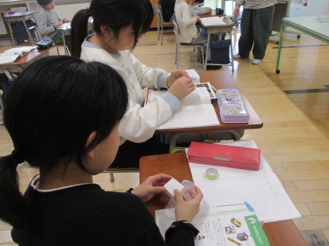 4年生は、展開図を書いて直方体を組み立てました。「ちょっとずれたけど箱の形になった」「本当に直方体になった」など、つぶやきながら学習していました。