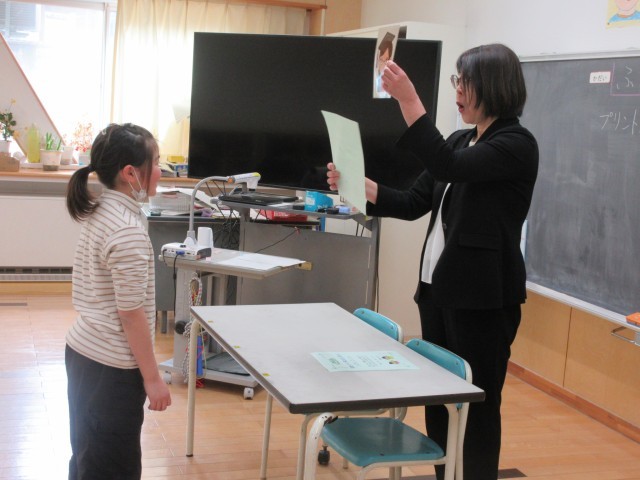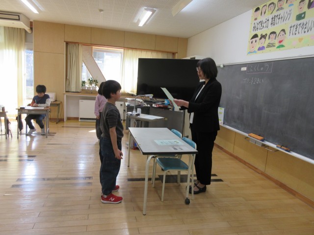 今日は、算数名人さんから「かけ算名人認定証」をいただきました。全員が、算数名人さんの「かけ算九九テスト」に合格しました。最初は、なかなか覚えられなくて苦戦していたこともあったのですが、全員が上手に言えるようになりました。賞状をもらい方は、卒業式で6年生を観ていたから、上手にもらっていました。
