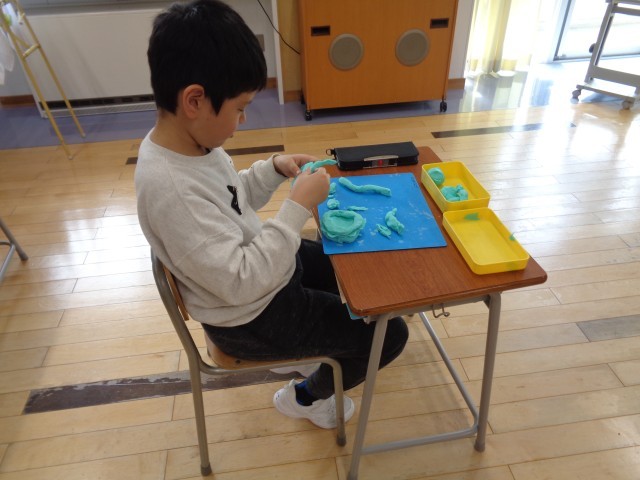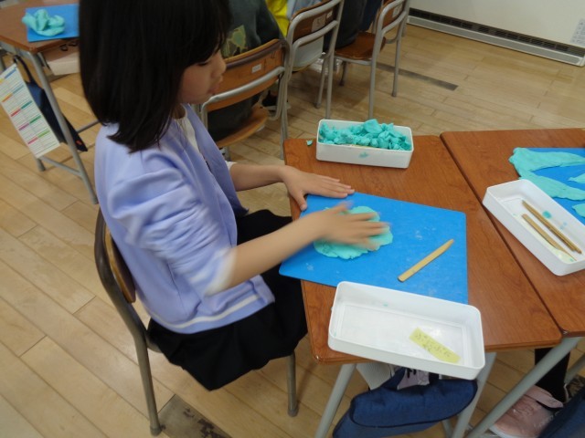 4年生の図工では、油粘土を使って平たい板を作り、その板を組み合わせて立体的な作品を完成させる活動をしています。子供達はどんな風に組み合わせたり、板の形を変えたりすると、思うような立体的な形ができるか試しながら、楽しんで粘土に親しんでいました。