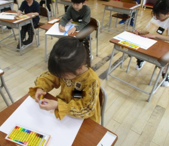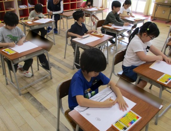 1年生は図画工作科の時間に「おひさまとぼく・わたしのすきなもの」の絵を描きました。おひさまや自分の好きなものを、思い思いに描いていました。完成した作品は、学習参観でご覧ください。
