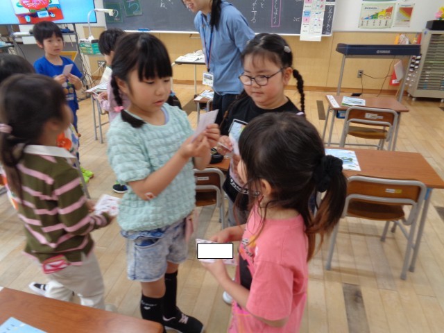 カードには、自分の名前と好きな物のイラストを描きました。きれいな文字で名前が書いてあり、かわいいイラストやかっこいいイラストもたくさんあって、素敵なカードが仕上がりました。お友達と自己紹介をしてカードを交換する時には、「◯◯ちゃん一緒に自己紹介しよう」「◯◯くんはゲームが好きなんだね」等と積極的に活動し、お互いのことを知ることができた様子でした。