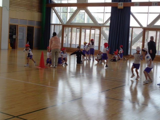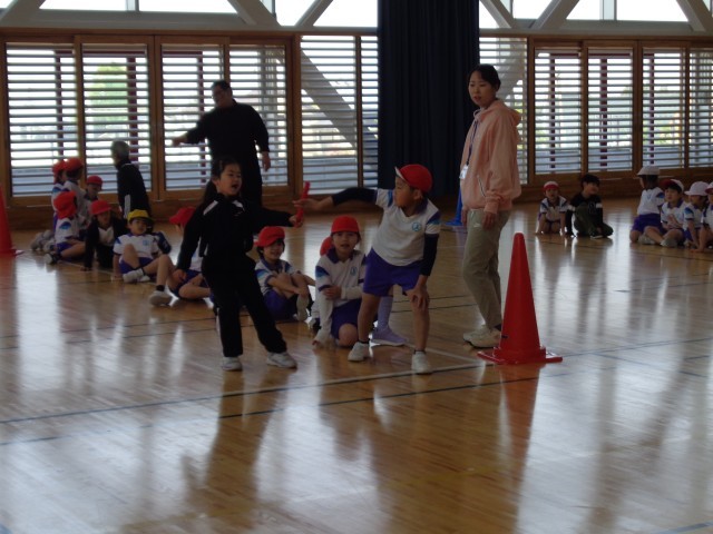 短い距離を走ってスタートダッシュの練習をした後、色団ごとにバトンパスの練習をしました。バトンを渡す際に「はい!」と大きい声で合図を出したり、バトンの下を持って相手にパスをしたりすることができました。また、2年生が1年生にバトンパスのための正しい手の出し方を教えている姿を見て、成長を感じました。