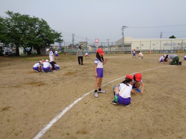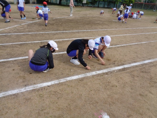 17日の運動会に向けて、さわやかタイムにグラウンドの草むしりと石拾いをしました。