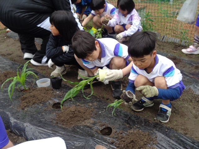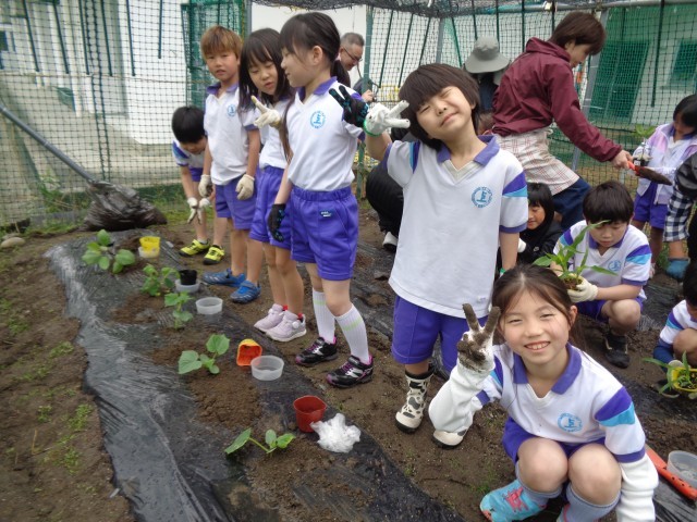 1時間目の時間に地域の方をお招きして、野菜の苗植えを行いました。子供達は、苗の植え方のお話をよく聞いて、実際に畑に植えました。子供達からは、「教わった通りできたよ」「水やりをかんばろう」などとてもうれしそうな声が聞こえてきました。