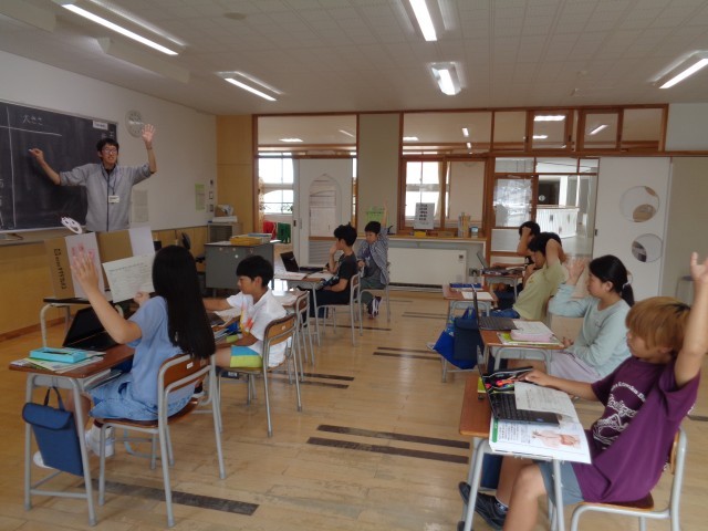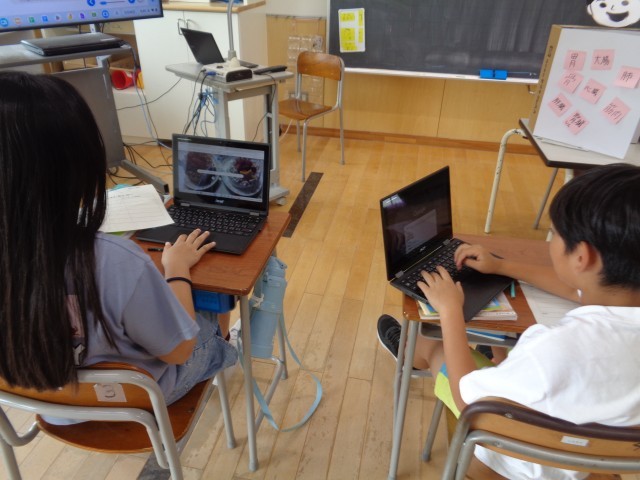 担任が作成した模型にお菓子を食べさせるとそのままの形で下に落ちてきた様子を見て、「消化されていない!」「食べてすぐに出てこないよ」等と興味津々の様子でした。その後、食べ物が便として排出されるまでに通る臓器の名前とその大きさを調べ、全体で共有しました。教科書やクロムブックを駆使して、友達やクラスメイトと相談しながら学習を進めることができました。