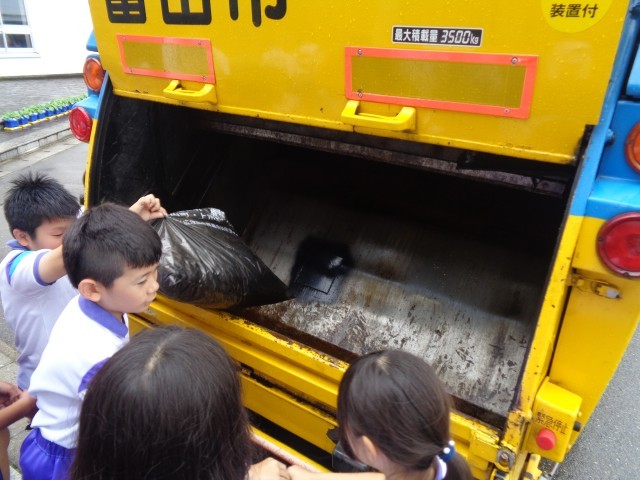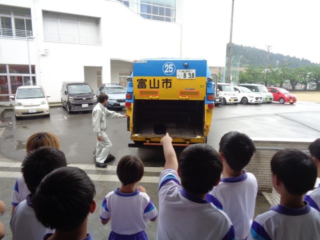 4年生は、富山県のごみがたくさん出ていることを知りました。そしてこのままいくと埋め立てる場所もなくなってしまうということから、どのようにしてゴミを減らしていったらよいのかを考えました。3Rとは何かを聞いたり、実際のゴミ収集車を見たりすることで、ゴミ問題に対してより興味を深めていました。