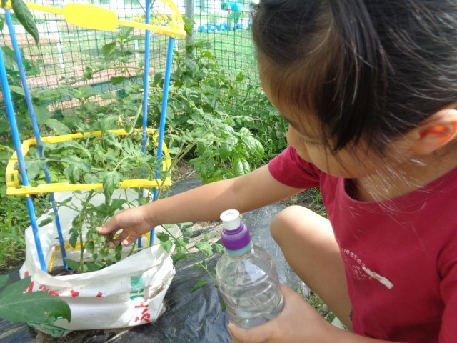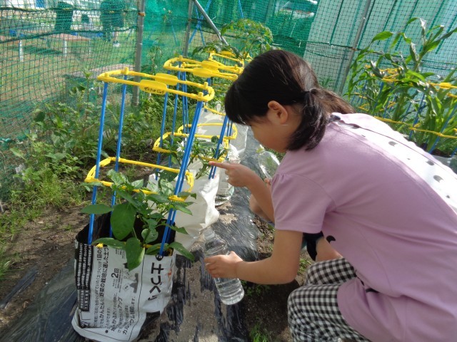 一緒に畑へ行ってみると、5月に植えた苗に花や小さな実がついていました。子供たちは、「いつになったら取ってもいいかな」「早く大きくなってほしいな」と、野菜の成長をとても楽しみにしている様子です。