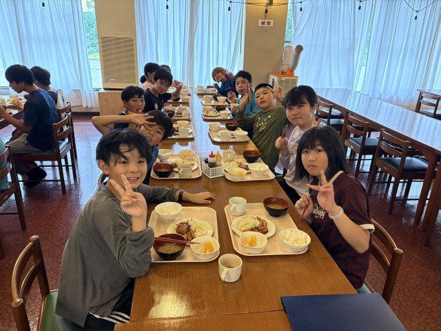 夕食を食べています。このあとはキャンプファイヤー、入浴、就寝の予定です。