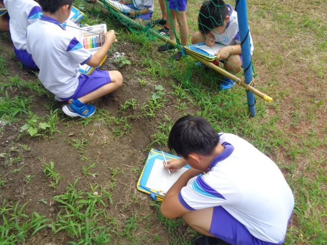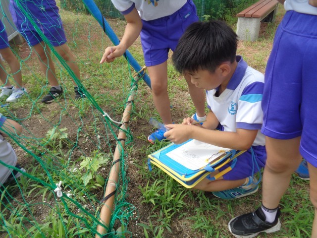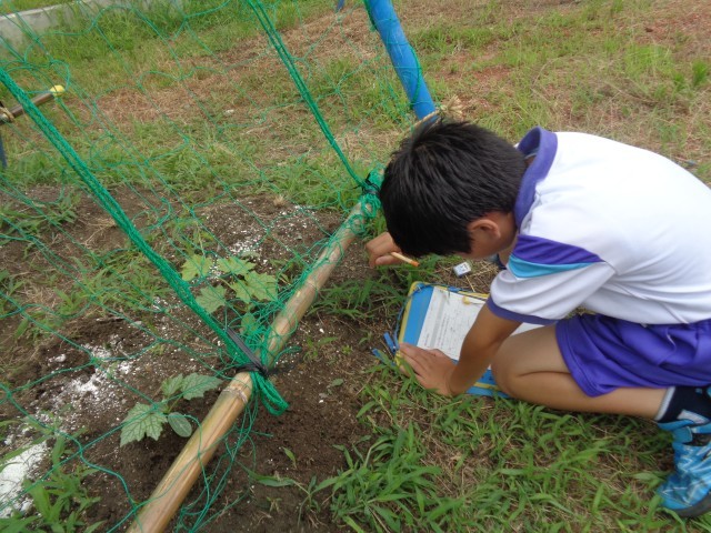 4年生はヘチマが大きくなってきていることに注目し、観察を行いました。葉の形や手触りなどを実際に見たり、触ったりしながら成長を実感していました。