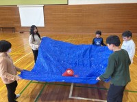 小雨が降っているので、体育館でイニシアティブゲームをしています。4つの課題を班で...
