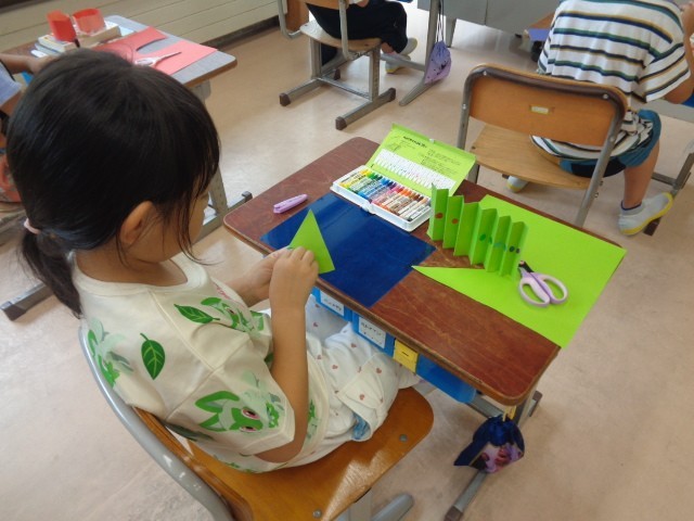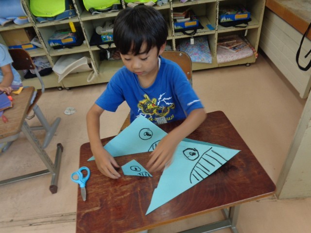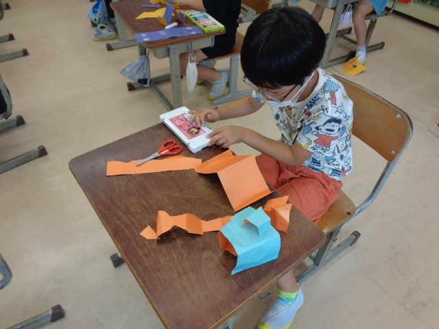 図画工作科の学習では、紙を折って立てた形から思いついたものを作りました。紙の折り方や立て方を工夫しながら活動しました。