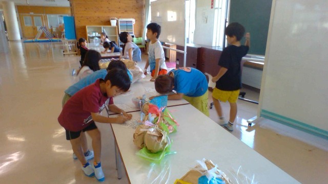 図画工作科でつくった「くしゃくしゃ ぎゅっ」の作品を互いに見合いました。