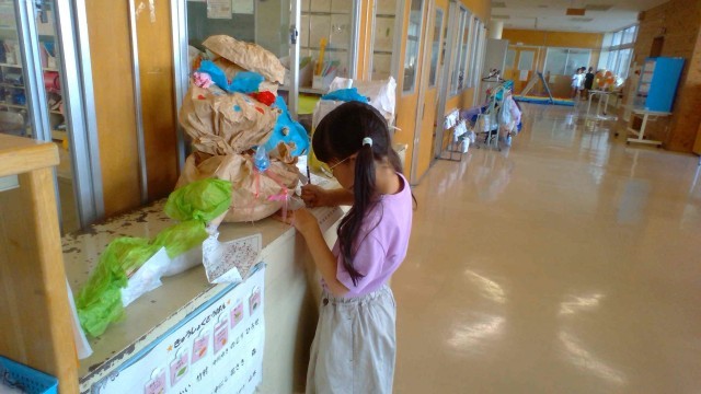 紙袋に新聞を詰めたり、ひもでしばったりして整えた形のアイディアや、お花紙や折り紙を使った飾りつけに注目して、よいところをメッセージカードに書きました。