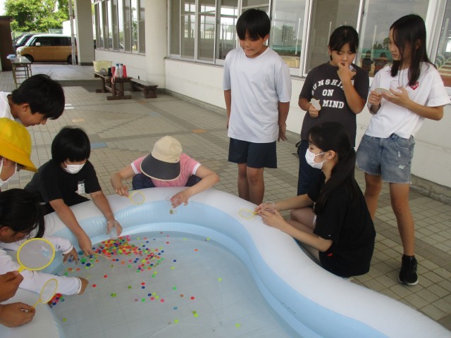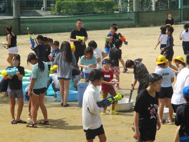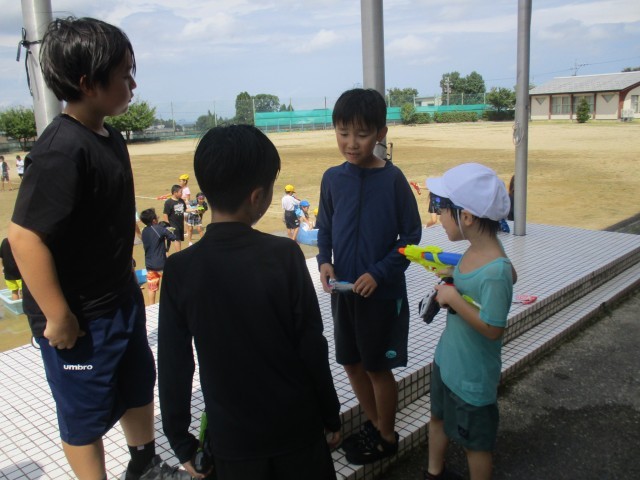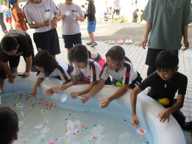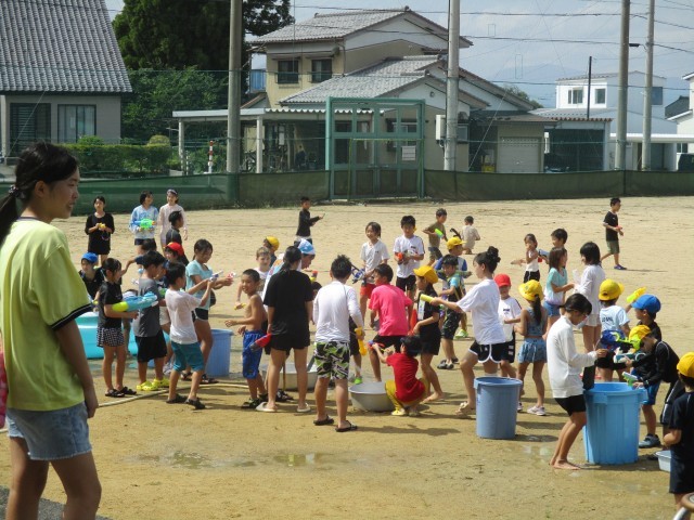 楽しみにしていたスプラッシュフェスティバルが開催されました。まだ、暑さの残る日にちょうど心地よい冷たさでした。水かけ以外にも、ボールすくいや輪投げなどもありました。みんなで楽しみました。